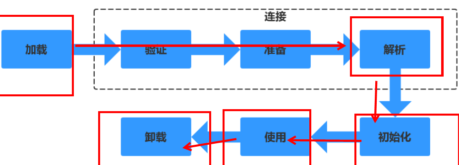 3.初始化,为类的静态变量赋予正确的初始值4.使用,new出对象程序中使用