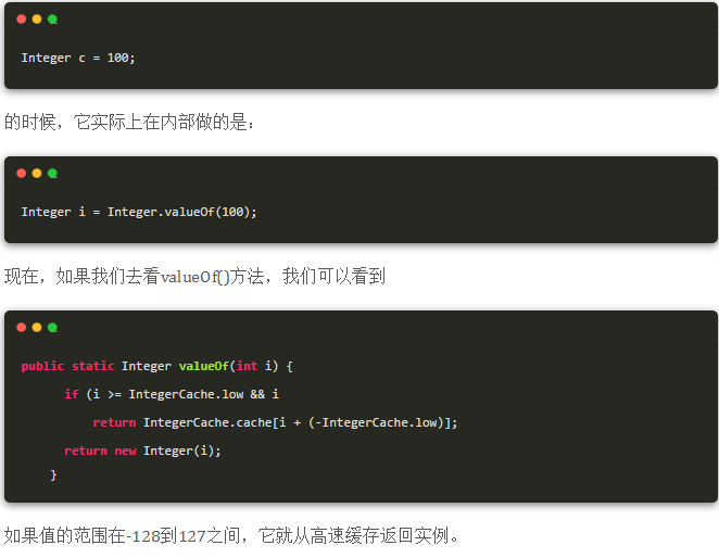 这就是它有趣的地方了。如果你看去看 Integer.java 类,你会发现有一个内部私有类,IntegerCache.java,它缓存了从-128到127之间的所有的整数对象。所以事情就成了,所有的小整数在内部缓存,然后当我们声明类似——