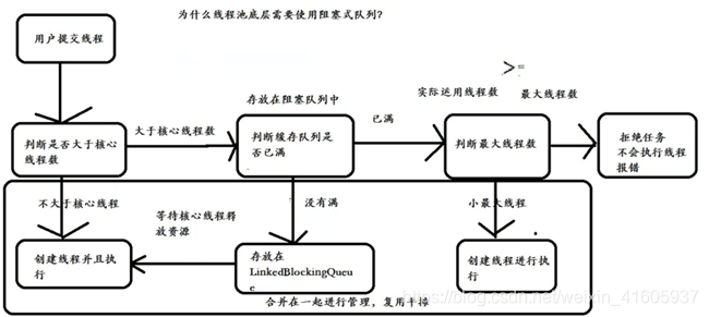 如果当前线程池中的线程数目>=corePoolSize,则每来一个任务,会尝试将其添加到任务缓存队列当中,若添加成功,则该任务会等待空闲线程将其取出去执行;若添加失败(一般来说是任务缓存队列已满),则会尝试创建新的线程去执行这个任务;如果当前线程池中的线程数目达到maximumPoolSize,则会采取任务拒绝策略进行处理;