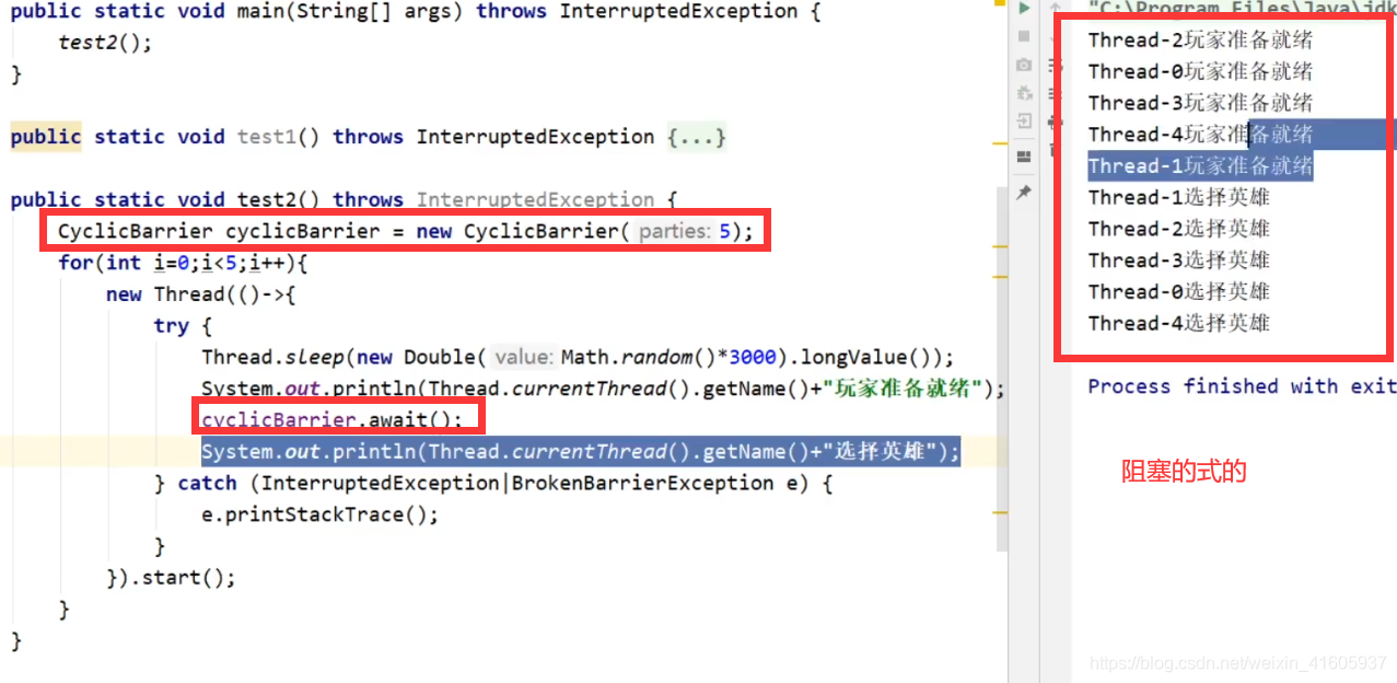 | CyclicBarrier | 让一组线程达到一个同步点时被阻塞,知道最后一个线程达到同步点时候,屏障才会开们,所有被拦截的线程才会继续执行。await()函数每被调用一次,计数便会减少 1(CyclicBarrier 设置了初始值),并阻塞住当前线程。 当计数减至 0 时, 阻塞解除, 所有在此 CyclicBarrier 上面阻塞的线程开始运行。 |