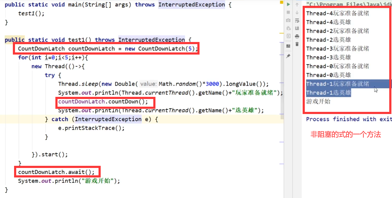 | CountDownLatch | CountDownLatch 允许一个或多个线程等待其他线程完成操作。主线程必须在启动其他线程后立即调用 await()方法。 这样主线程的操作就会在这个方法上阻塞, 直到其他线程完成各自的任务。 当某线程调用该 CountDownLatch 对象的await()方法时, 该线程会等待“共享锁” 可用时, 才能获取“共享锁” 进而继续运行。 |